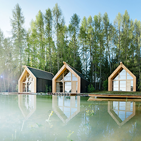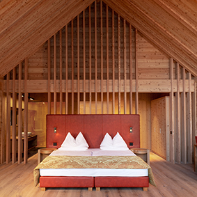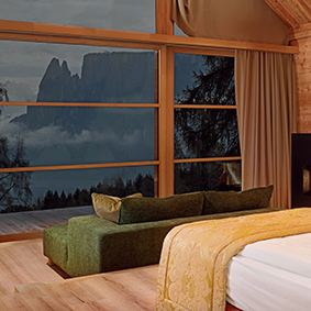 Es ist eine Architektur, die sich nicht über die Landschaft erhebt, sondern Teil von ihr wird. Inspiriert von den Lodges in Afrika. Ein Spiel mit Natur und Natürlichkeit. Gerade Linien. Keine Schnörkel. Unbehandelte Fichten- und Lärchenhölzer schmücken die Gebäude, Eichenholz die Böden. Kunstvolle Drucke zieren die Wandpaneele in der Lobby. Dafür wurden einzelne Bretter in die falsche Richtung gehobelt, der Eindruck eines Reliefs entsteht. In allen Suiten und Chalets gibt es eine Bio-Sauna und einen Kamin. Visualisiert und entworfen haben die ADLER Lodge RITTEN die Inhaber Andreas und Klaus Sanoner mit dem Südtiroler Architekten Hugo Demetz.